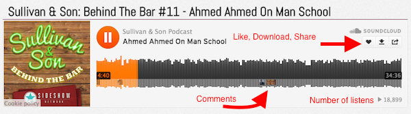 Like Libsyn, SoundCloud offers an embeddable player, however, unlike Libsyn, this player allows users to comment on specific portions of the song. In addition, the player has social share options, so that listeners can easily share episodes to their social network, and the option to “like” or “download” a track. You can also follow a user on their SoundCloud page or go to their page to leave a comment on a track.