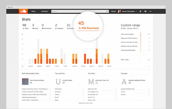 SoundCloud’s stats and analytics include the ability to see where your fans have listened to your podcast (player, mobile app, etc), the number of file downloads, the number of RSS downloads, and the top countries for those downloads. Finally, Pro users can hide the information displayed on most public players like comments, plays, reposts, and likes.